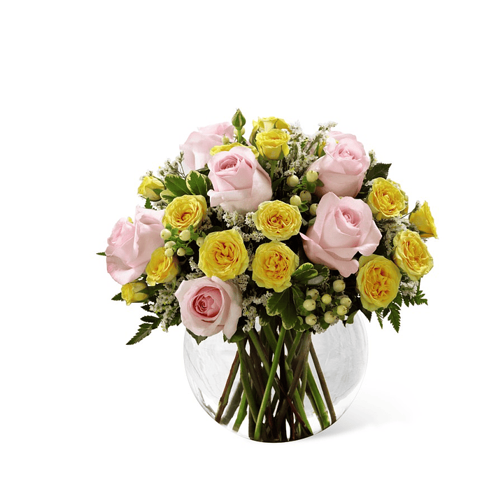 Bello florero redondo tipo esfera compuesto de rosas y minirosas dos tonos mas follaje.